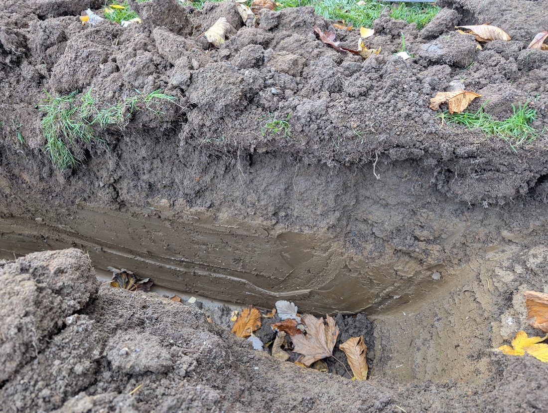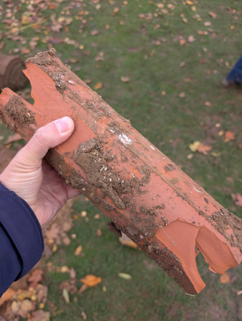 Historic drainage, installed some 40–50 years ago, was spaced approximately 15 metres apart. The clay pot shown in the picture dates from this period. While the original drains remain in reasonable condition, the spacing between them is now insufficient to cope with current conditions.