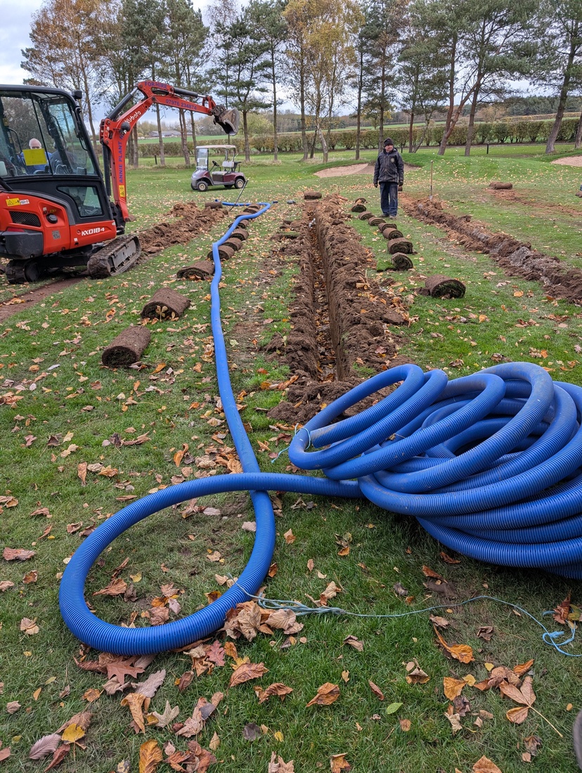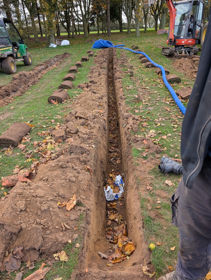 While we have the digger on site, we are also installing additional drainage lines in front of the 13th tee — another area prone to winter wetness — and to the short-left area of the 6th green. These additions should further improve surface conditions.